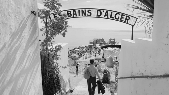 Ao mesmo tempo que frequenta um cinema com a namorada Marie, por exemplo, em dado momento, o cineasta direciona nosso olhar, por mais de uma vez, ao estado de apartheid local, enquanto os “nativos”, como diz a placa (e portanto, leia-se, “árabes”) são proibidos de ingressar nas dependências do estabelecimento. O mesmo cenário é válido quanto ao local em que trabalha, a casa de repouso na qual vive a mãe, a praia/piscina pública onde se reencontra com Marie, todos ambientes tomados apenas e tão somente por habitantes franceses da colônia, e vedados aos nativos daquela região, constantemente discriminados (vide todo o arco do vizinho machista).